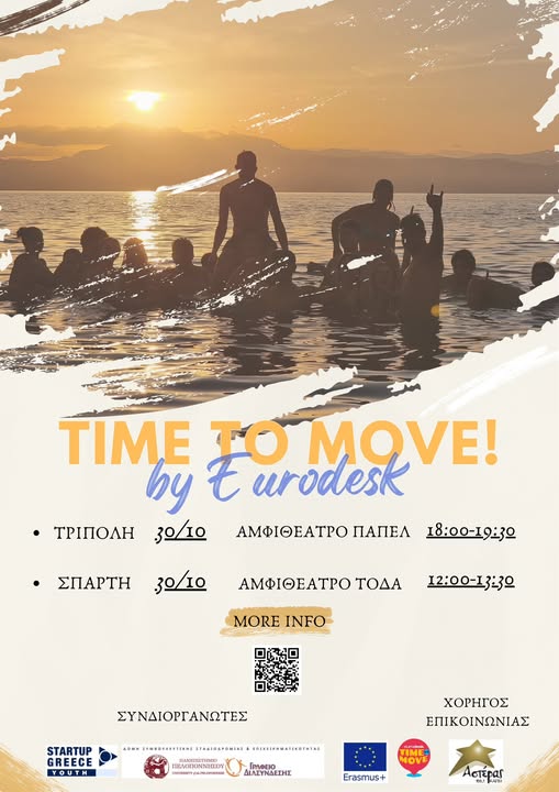 Το Eurodesk Πελοποννήσου, με την υποστήριξη της Δομής Συμβουλευτικής, Σταδιοδρομίας και Επιχειρηματικότητας του Πανεπιστημίου Πελοποννήσου, διοργανώνει την ενημερωτική ημερίδα “Time to Move” για όλους τους φοιτητές και τις φοιτήτριες!