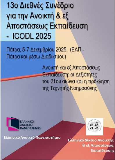 Δημοσιεύτηκε η πρώτη Ανακοίνωση για το 13ο Διεθνές Συνέδριο για την Ανοικτή και εξ Αποστάσεως Εκπαίδευση (International Conference in Open and Distance Learning- ICODL 2025), με θέμα «Ανοικτή και εξ Αποστάσεως Εκπαίδευση: Οι Δεξιότητες του 21ου αιώνα και η Πρόκληση της Τεχνητής Νοημοσύνης», που συν-διοργανώνεται από τη Σχολή Ανθρωπιστικών Επιστημών του Ελληνικού Ανοικτού Πανεπιστημίου (ΕΑΠ) και το Ελληνικό Δίκτυο Ανοικτής και εξ Αποστάσεως Εκπαίδευσης (ΕΔΑΕ), και θα διεξαχθεί (διαδικτυακά και διά ζώσης) στην Πάτρα, στις 5-7 Δεκεμβρίου 2025.