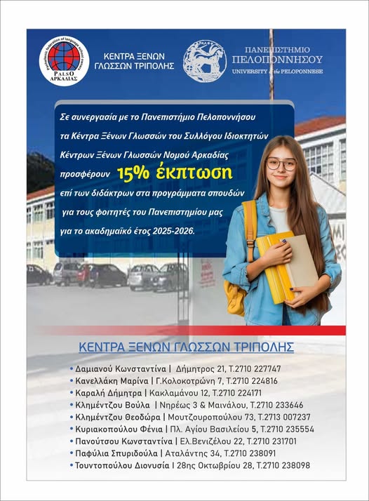 Επειδή οι ξένες γλώσσες είναι must, καλωσορίζουμε τους φοιτητές μας με 15% έκπτωση επί των διδάκτρων στα προγράμματα σπουδών τους για το ακαδημαϊκό έτος 2025-2026!!