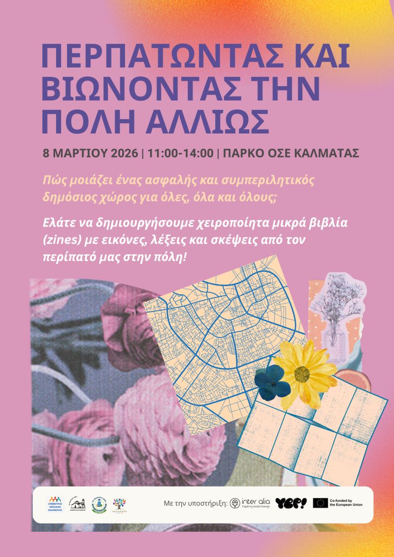 Με αφορμή τη Διεθνή Ημέρα της Γυναίκας (8 Μαρτίου), το Συμβούλιο Νεολαίας του Δήμου Καλαμάτας, με την υποστήριξη της Inter Alia και του ευρωπαϊκού προγράμματος YEP, προσκαλεί σε ένα ανοιχτό εργαστήριο που συνδυάζει έναν συλλογικό περίπατο στην πόλη με τη δημιουργία χειροποίητων μικρών βιβλίων (zines).