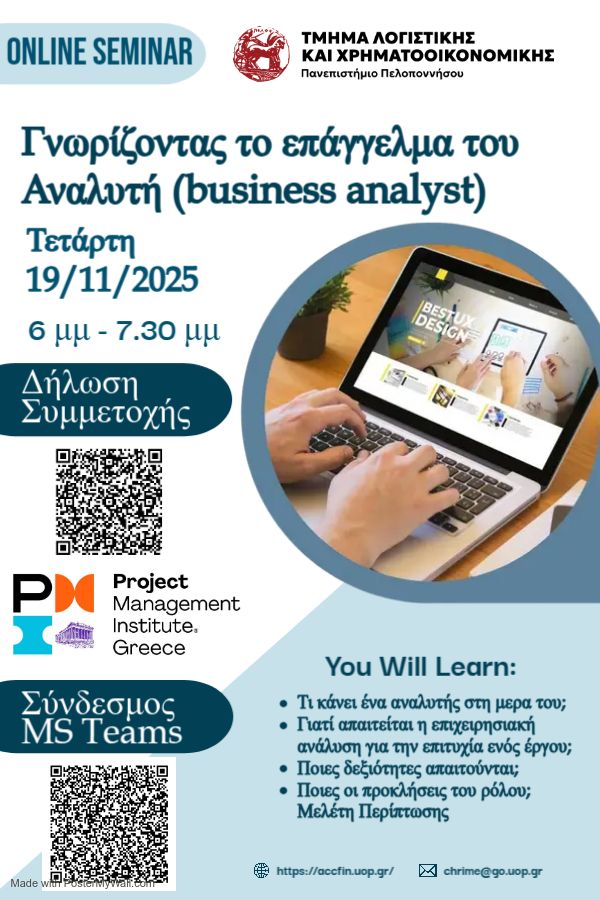 Την Τετάρτη 19 Νοεμβρίου 2025 και ώρα 18:00-19:30 το Τμήμα Λογιστικής και Χρηματοοικονομικής σε συνεργασία με τον οργανισμό PMI Greece Chapter διοργανώνει διαδικτυακό σεμινάριο με τίτλο “Γνωρίζοντας το επάγγελμα του Αναλυτή (business analyst)”. Την επιμέλεια έχει αναλάβει ο κος George Sioutzos, ενώ το συντονισμό έχει αναλάβει ο Αναπληρωτής Καθηγητής Vasileios Giannopoulos.