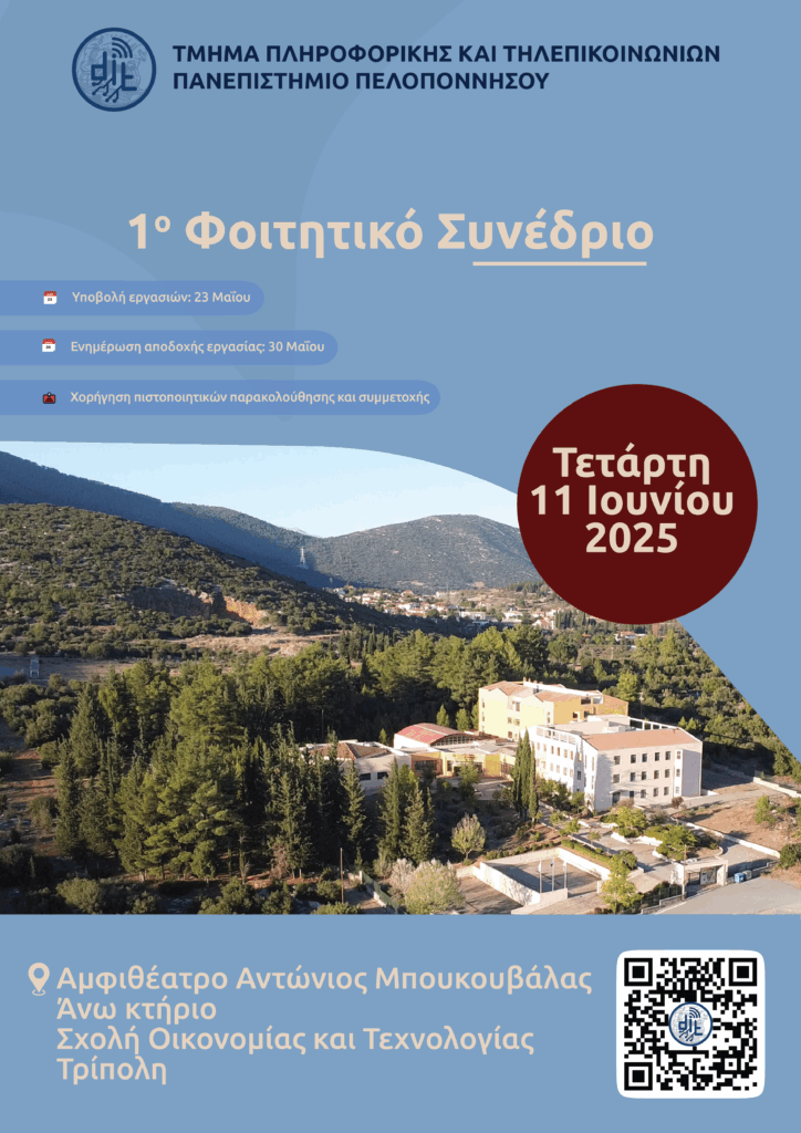 Το 1ο Φοιτητικό Συνέδριο του Τμήματος Πληροφορικής και Τηλεπικοινωνιών του Πανεπιστημίου Πελοποννήσου, θα πραγματοποιηθεί την Τετάρτη, 11 Ιουνίου 2025, στις εγκαταστάσεις του Τμήματος στην Τρίπολη, στο αμφιθέατρο «Αντώνιος Μπουκουβάλας» της Σχολής Οικονομίας και Τεχνολογίας.