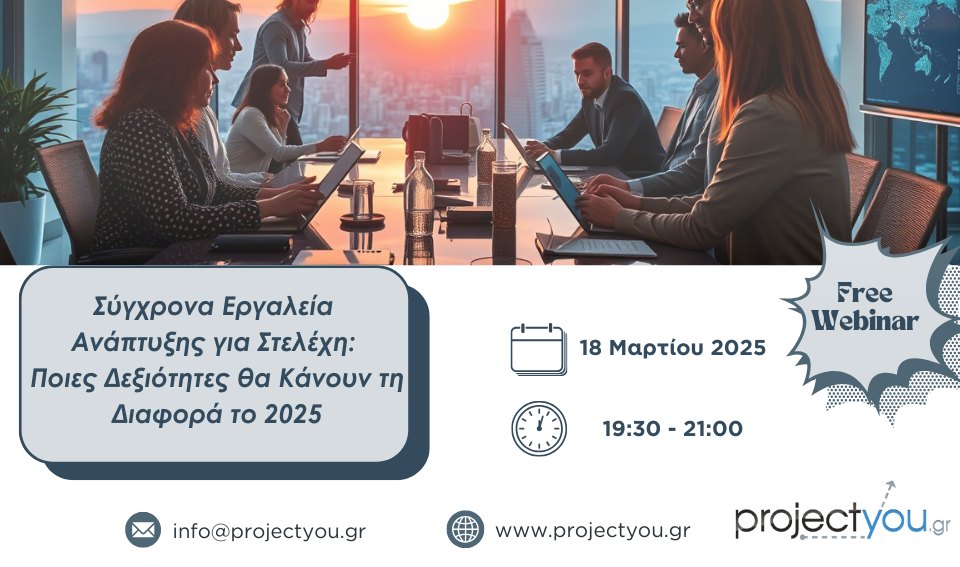 Ποιες δεξιότητες θα κάνουν τη διαφορά το 2025; Πώς μπορούν οι οργανισμοί να ενισχύσουν την απόδοση των στελεχών τους; Η projectyou απαντά σε αυτά τα ερωτήματα, προσφέροντας μια δωρεάν διαδικτυακή ενημέρωση την Τρίτη, 18 Μαρτίου στις 19:30.