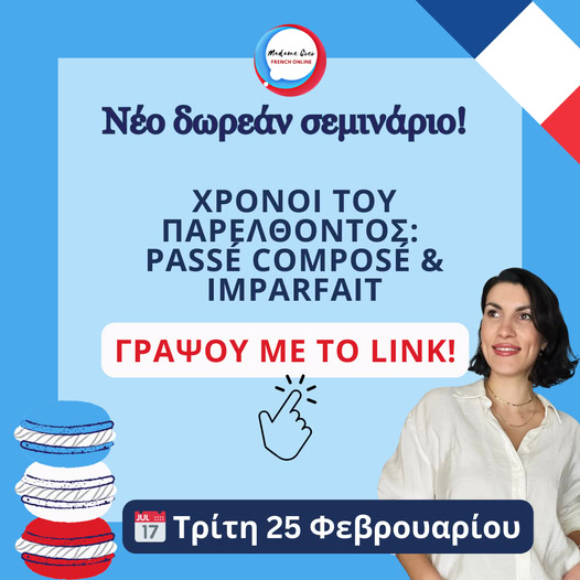 Τρίτη 25 Φεβρουαρίου, 9 μ.μ. (ώρα Ελλάδος) – αυτή τη φορά, θα μάθουμε πώς να χρησιμοποιούμε σωστά τους βασικούς χρόνους του παρελθόντος στα Γαλλικά!