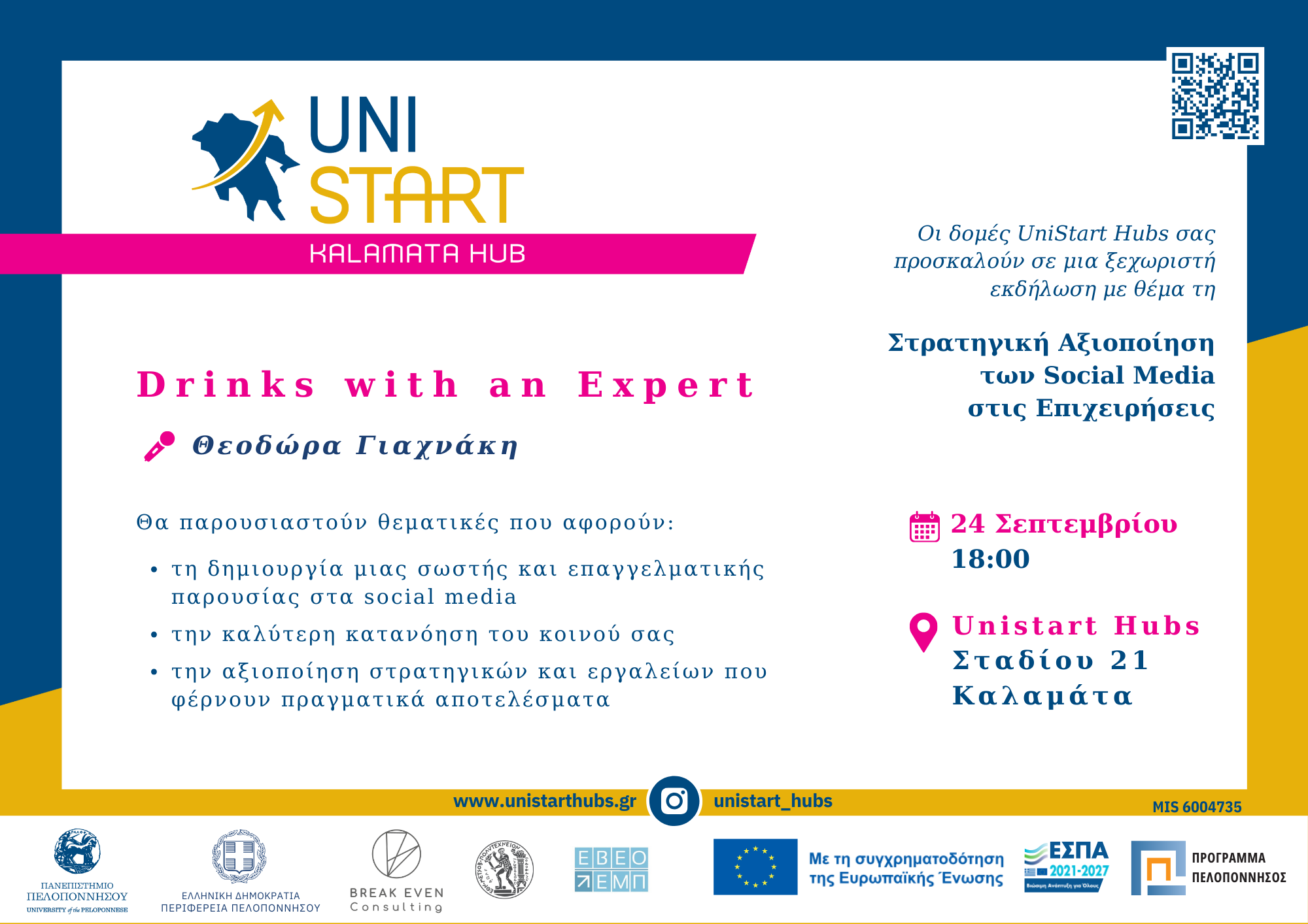 Eκδήλωση «Drinks with an Expert», με καλεσμένη τη Θεοδώρα Γιαχνάκη, Social Media & Project Manager και Ιδρύτρια της Cyclus. Η εκδήλωση θα εστιάσει στη στρατηγική αξιοποίηση των Social Media για επιχειρήσεις, μέσα από πρακτικά παραδείγματα, case studies και συζήτηση με τις ωφελούμενες επιχειρήσεις.