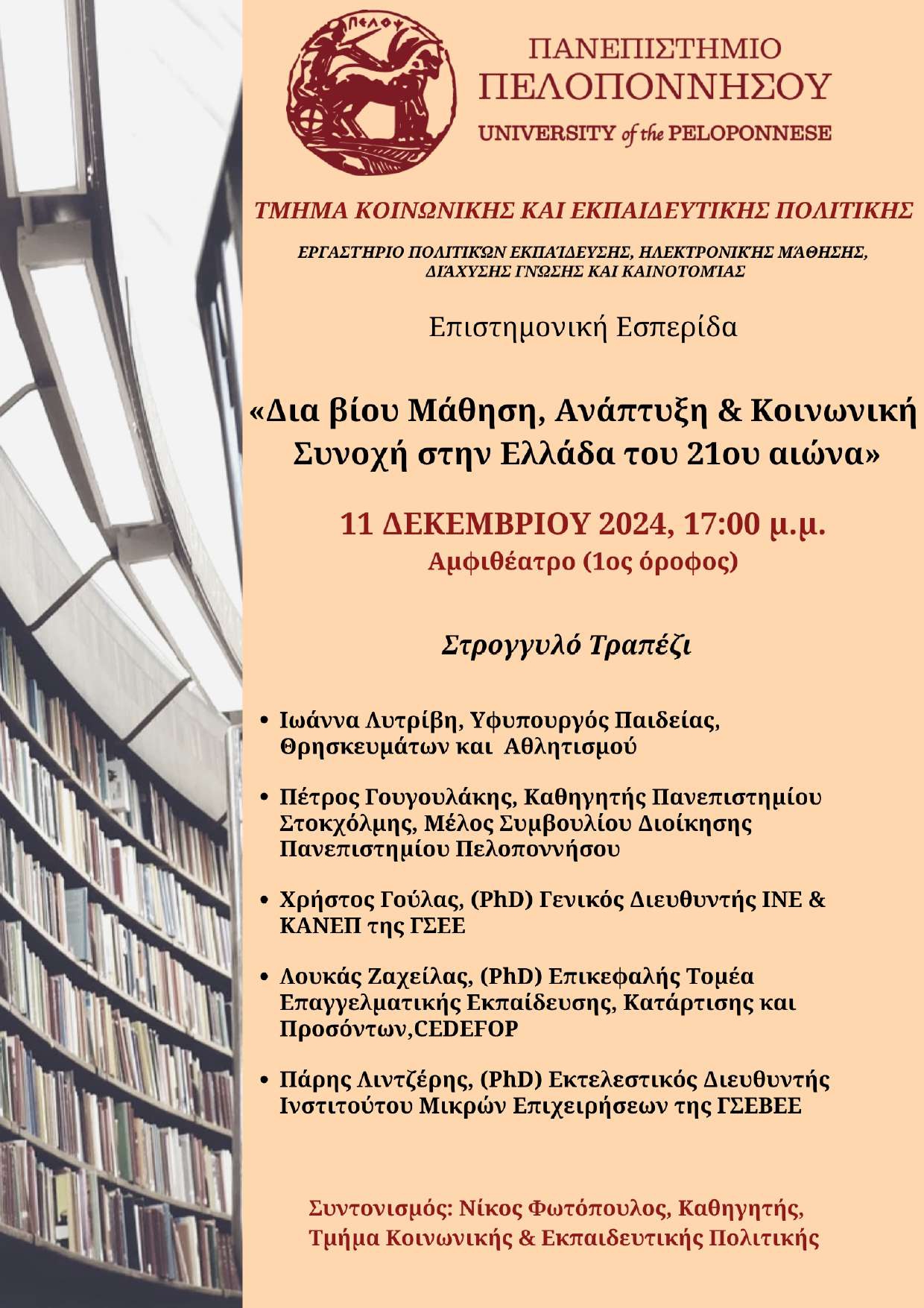 Το Εργαστήριο Πολιτικών Εκπαίδευσης, Ηλεκτρονικής Μάθησης, Διάχυσης Γνώσης και Καινοτομίας του Τμήματος Κοινωνικής και Εκπαιδευτικής Πολιτικής του Πανεπιστημίου Πελοποννήσου σας προσκαλεί στην Επιστημονική Εσπερίδα που διοργανώνει με θέμα «Δια βίου Μάθηση, Ανάπτυξη και Κοινωνική Συνοχή στην Ελλάδα του 21ου αιώνα», την Τετάρτη, 11 Δεκεμβρίου 2024 και ώρα 17:00 μ.μ. στο Αμφιθέατρο του Τμήματος (Δαμασκηνού και Κολοκοτρώνη, Κόρινθος).