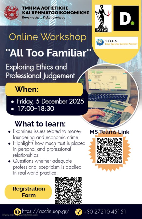 Το Τμήμα Λογιστικής και Χρηματοοικονομικής του University of the Peloponnese, σε συνεργασία με το Institute of Chartered Accountants in England and Wales (ICAEW) και το Deloitte, προσκαλεί προπτυχιακούς και μεταπτυχιακούς φοιτητές σε ένα διαδραστικό διαδικτυακό εργαστήριο με την εκπαιδευτική ταινία του ICAEW “All Too Familiar”.