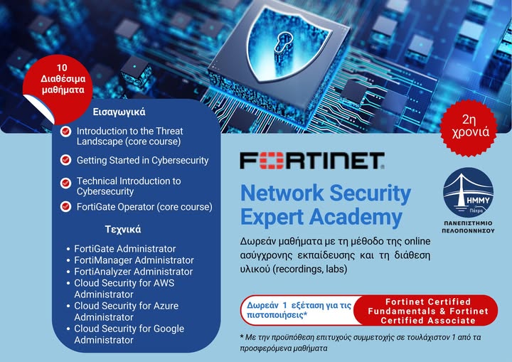 Το Τμήμα ΗΜΜΥ ΠΑ.ΠΕΛ., στο πλαίσιο της συνεργασίας με την εταιρεία Fortinet, η οποία κατέχει ηγετικό ρόλο παγκοσμίως στις λύσεις και υπηρεσίες κυβερνοασφάλειας, ανακοινώνει τη λειτουργία για δεύτερη συνεχόμενη χρονιά, της Fortinet Network Security Expert Academy στο Τμήμα και προσκαλεί κάθε ενδιαφερόμενο/η φοιτητή/τρια όλων των βαθμίδων να δηλώσουν ενδιαφέρον παρακολούθησης των διατιθέμενων εκπαιδευτικών ενοτήτων που επιθυμούν.