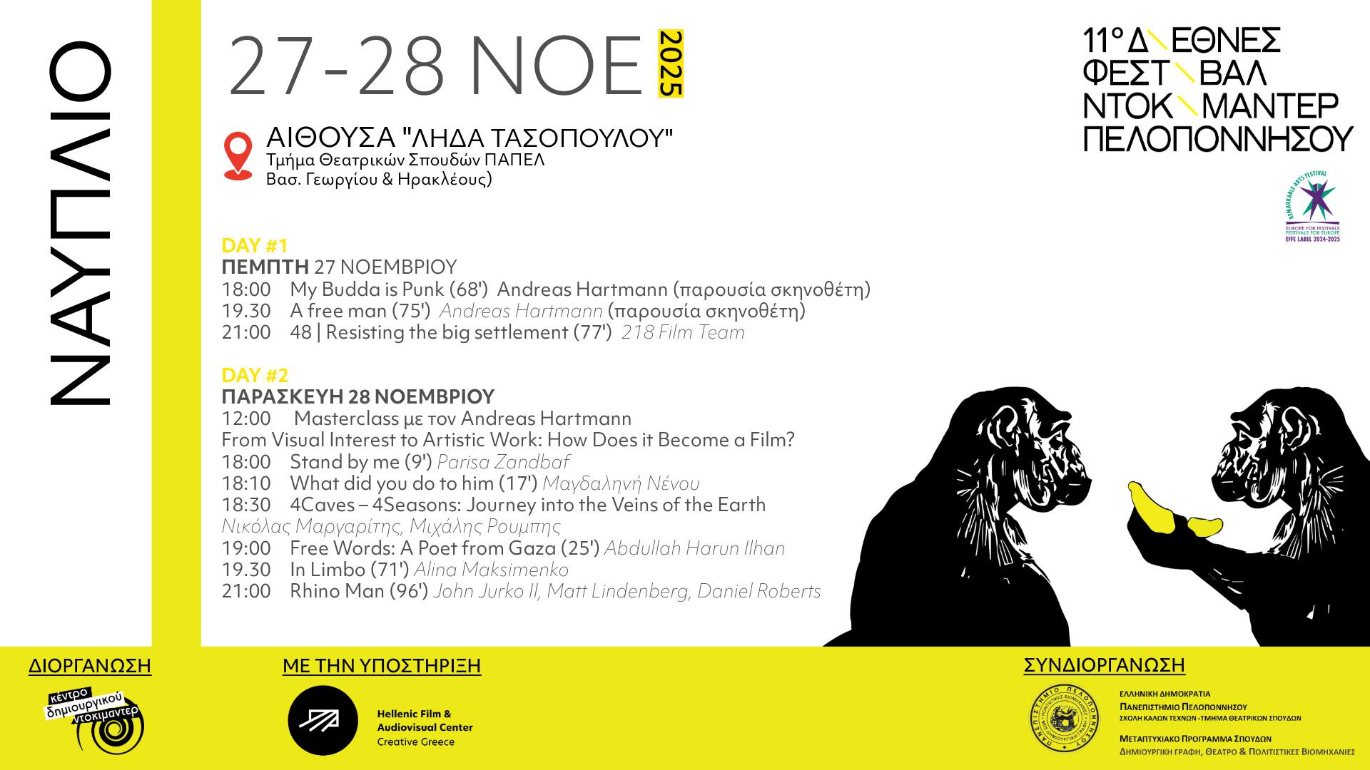 • Πέμπτη 27/11 ώρες: 18.00-22.00: Προβολές βραβευμένων ντοκιμαντέρ στην Αίθουσα Λήδα Τασοπούλου (παρουσία του διεθνούς φήμης Γερμανού σκηνοθέτη Andreaw Hartmann).Είσοδος ελεύθερη για το κοινό της πόλης.